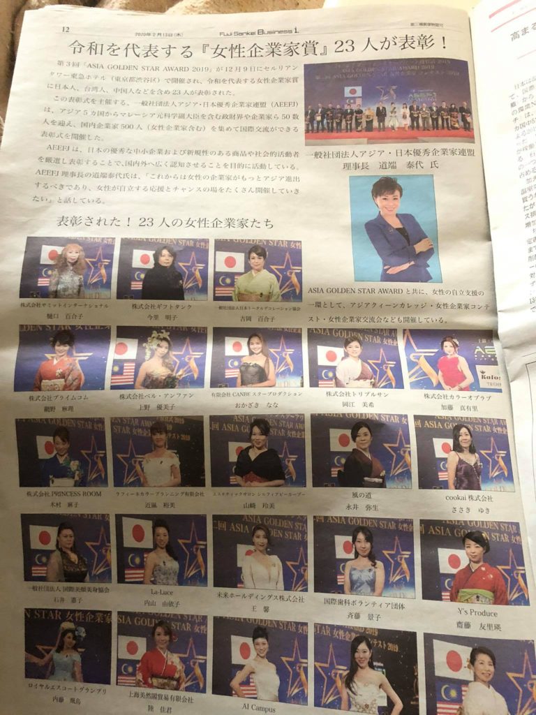 (お知らせ)2020年フジサンケイBusiness I.「令和を代表する女性企業家たち」AICS学長、SAVIC研究所長のZinney Imasatoが掲載