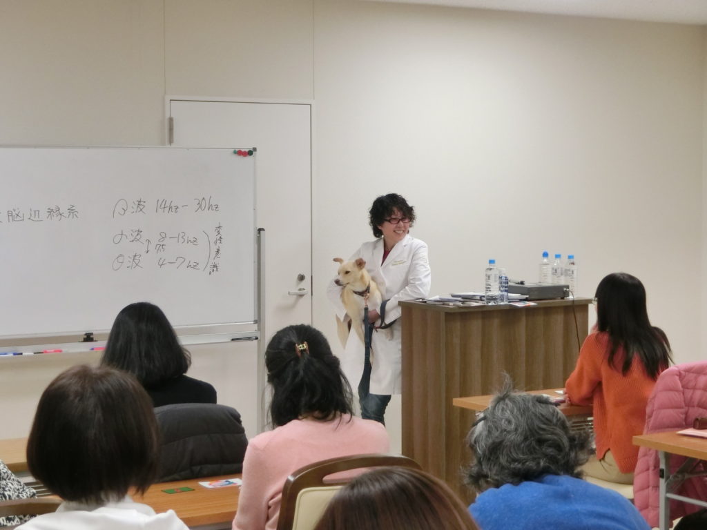 午前中は「アニマルコミュニケーションとは」という基礎のレクチャーから始まり α波、β波 そしてγ波などについて、科学的な側面から、それぞれの周波数の領域や脳の構造や仕組みなどを説明しながら、アニマルヴォイスアナライザーでのデモンストレーションでアニマルコミュニケーションに最適な脳波の状態を体感いただきました。